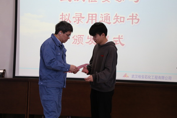 会上,检安公司与公司12名应届毕业生初步达成了签约意向。会上,检安公司高级巡视员冉波为毕业生发放录用通知。