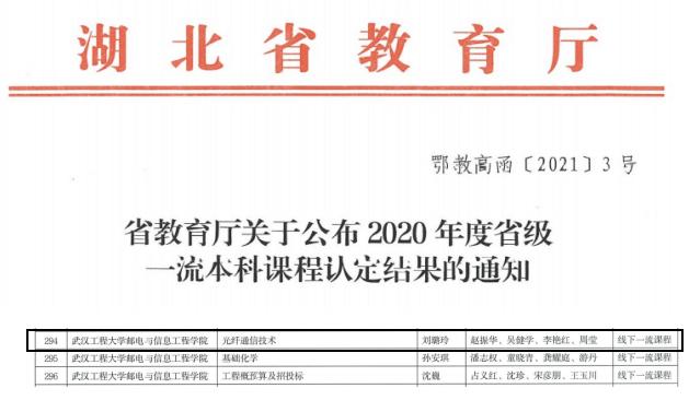 近日,湖北省教育厅下发《省教育厅关于公布2020年度省级一流本科课程认定结果的通知》(鄂教高函〔2021〕3号),公司《光纤通信技术》课程被认定为2020年省级一流本科课程。