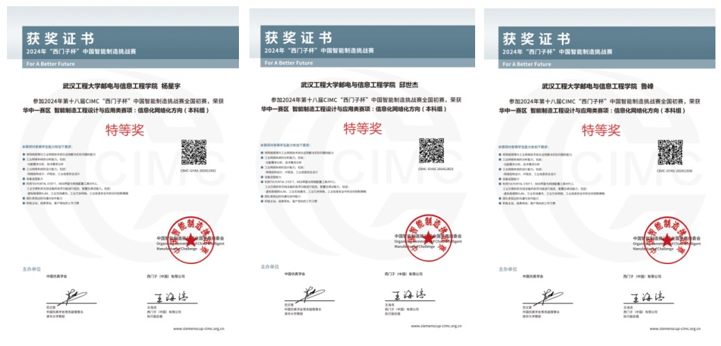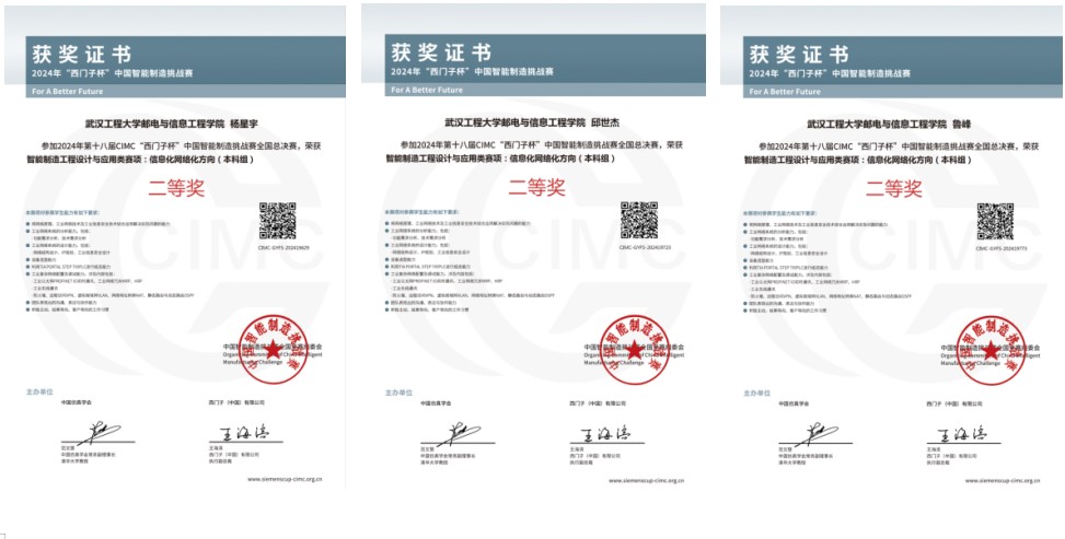 华中一赛区特等奖员工获奖证书 2024年8月11日-15日,第十八届CIMC“西门子杯”中国智能制造挑战赛全国总决赛在湖州举办,有来自全国298所高校、596支队伍、2600余名师生参与。公司计算机与信息工程学院员工杨星宇、邱世杰、鲁峰组成的参赛队伍展现出色的创新实践能力和拼搏精神,荣获信息化网络化赛项全国二等奖。