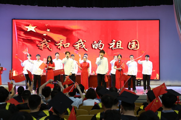 典礼在全体师生合唱《我和我的祖国》的歌声中拉开序幕。