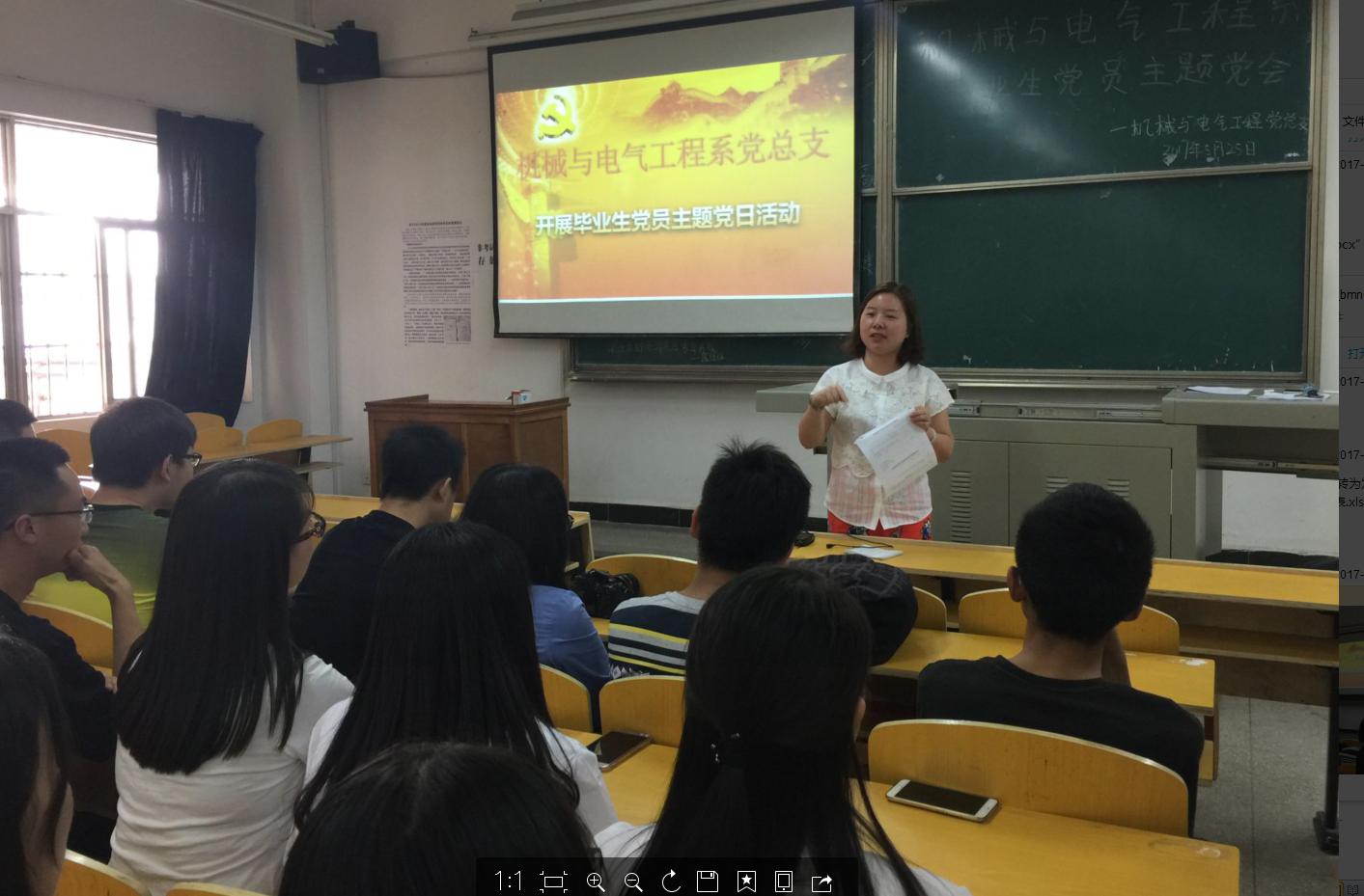 为学习贯彻党的十八届六中全会精神,按照304am永利集团党风廉政教育活动月文件要求,进一步加强党员党性修养,增强党员的“四个意识”,机械系党总支于2017年5月25日下午四点在3303教室举行了2017届毕业生党员主题党日活动。本次活动由机械系党总支副书记李承亮同志主持,304am永利集团党委组织宣传部徐章同志,系部党支部书记以及全体毕业生党员参加本次活动。 活动伊始,全体党员重温入党誓词仪式。在毕业生党员代表李航同志的带领下,全体党员在党旗下庄严宣誓。通过这种仪式,引导教育毕业生党员牢记入党誓词,增强党员责任意识和党性觉悟,教育党员勿忘初心,继续前进,永葆共产党员的先进性和纯洁性。 紧接着,党委组织宣传部徐章同志跟全体毕业生党员进行了党组织关系转接手续的培训工作,徐章同志重点强调了党员组织关系转接工作的重要性,她指出:毕业生党员要按照304am永利集团党委组织宣传部的要求,认真落实党组织关系转接手续,严格填写党组织关系转接的表格,保管好学院开具的毕业生党员组织关系转接介绍信,并且按照规定时间办理好党组织关系转接手续。同时,她也提出了几点希望,希望全体毕业生党员真正牢记入党誓词,做好毕业生党组织关系转接工作,按照《党章》的要求,认真履行党员权利和义务,用实际行动贯彻“两学一做”主题教育活动。 最后,系部党总支副书记李承亮同志给全体毕业生党员进行了党课授课。李承亮同志结合《准则》和《条例》内容,从坚定理想信念、严明党的政治纪律、严格党的组织生活制度和党风廉政教育等方面进行详细讲解。他指出每名毕业生要要坚定理想信念,加强理论学习,不断增强党性修养,增强党员政治意识,纪律意识,核心意识和看齐意识,落实好党组织关系转接工作,在今后的工作中,以一名党员的标准严格要求自己,按照“三严三实”要求,筑牢拒腐防变的思想防线,以优异的成绩来回报母校、回报社会。 开展毕业生党员集体宣誓活动 ![]()