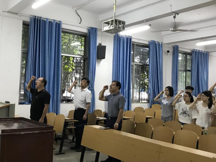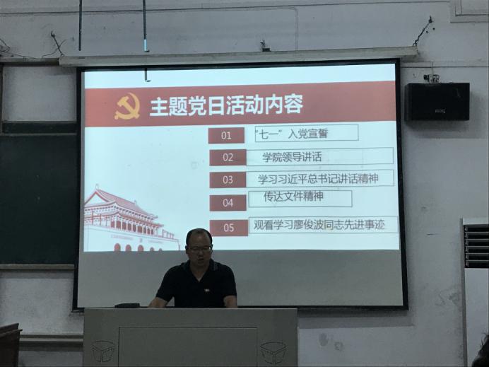此次活动分为四个环节,主要包括“七一”入党宣誓、学习习近平总书记讲话精神、传达学习省第十一次党代会精神、学院领导讲话几个部分。