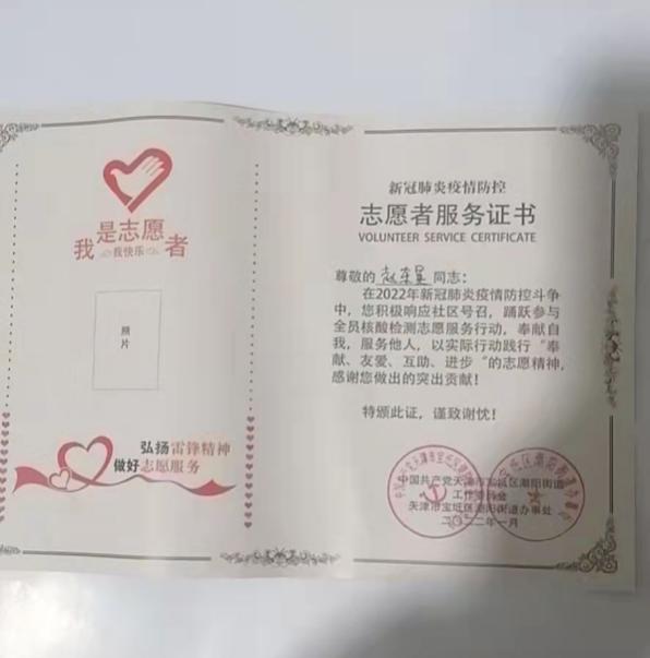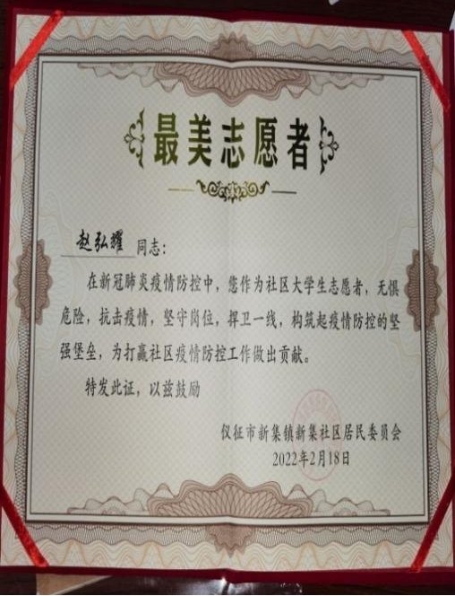 7、赵弘耀,共青团员,2020级自动化01班员工。2022年1月4日至2月18日担任抗疫志愿者,参加疫情防控工作,进行疫情防控摸排,对外来人员进行登记;在超市检查“双码”、进行测温、登记;在派出所进行档案整理及服务工作;协助社区完成日常事物工作。这是一次深入社会的实践,他将校园工作经验运用于实践中去,通过本次历练不断总结,提高自身综合素质。(审稿人:李承亮)