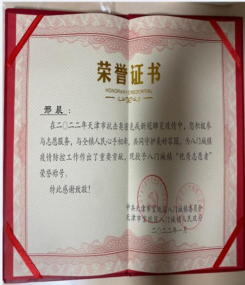 2、赵东星,中共党员,2018级电气工程及其自动化01班员工。该生作为一名党员,在平日的学习、工作和生活中能够充分发挥党员的先锋模范作用,不断改造自己的思想,不断磨炼自己的意志,努力做到政治上,思想上,行动上与党中央的要求保持一致。在得知天津出现本土疫情,主动请缨参加到志愿服务中来。2022年1月8日,他主动与村支书联系,希望参加到核酸检测志愿服务中来,为第一次全民核酸检测做铺垫。承担信息录入、四次的核酸检测、疫情宣传、“敲门行动”、站岗值班等工作。体现了新时代老员工的勇敢与担当,得到了本村和邻村领导干部以及全村人民的一度赞扬。