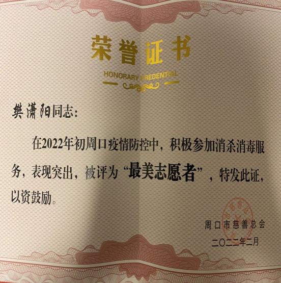 6、樊潇阳,入党积极分子,2020级电气工程及其自动化01班员工。自2022年1月5日起以志愿者的身份参加了疫情防控工作,通过16天的消杀工作,在社会实践中不断锻炼、完善自己,认识到了学以致用的真正含义,提高了社会责任感和实践能力,践行了“奉献、有爱、互助、进步”的志愿服务精神,希望在祖国需要的时候,能够把所学知识投身于社会,奉献给祖国和人民。