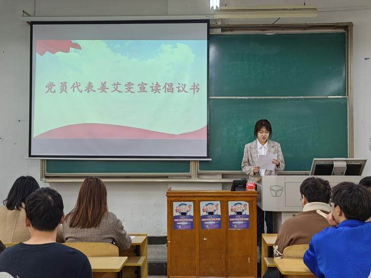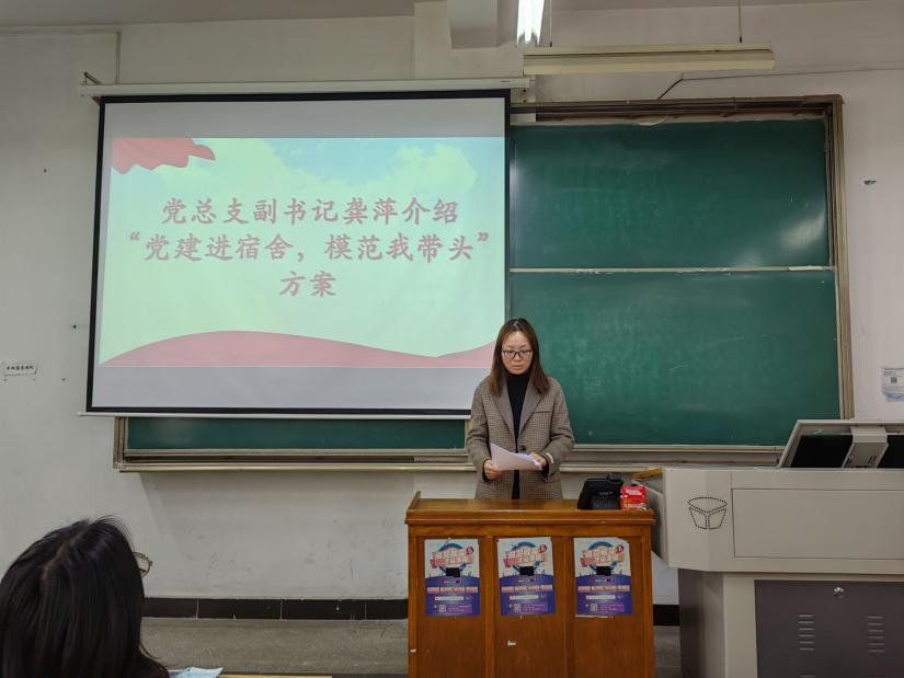 党员代表姜艾雯向全体党员、入党积极分子发出倡议,号召大家在宿舍主阵地站好理论宣讲岗、生活服务岗、宣传报道岗、志愿服务岗、困难帮扶岗、科研创新岗,充分发挥“一名党员一面旗帜、一间宿舍一个样板”的先锋模范作用,切实用实际行动践行“全心全意为人民服务”,把“有困难党员先行,有任务党员担当”落到实处。