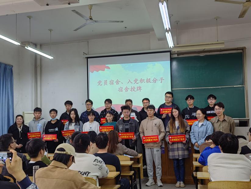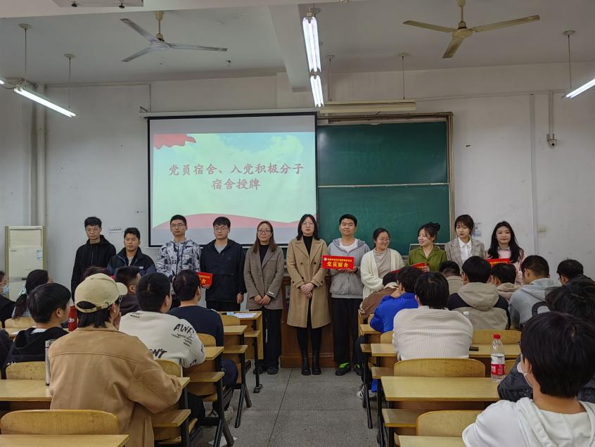 党总支书记胡旷、副书记龚萍为“党员宿舍”代表授牌,学工办主任梁璐、员工支部书记古玲霞、戚钰钒为“入党积极分子宿舍”代表授牌。