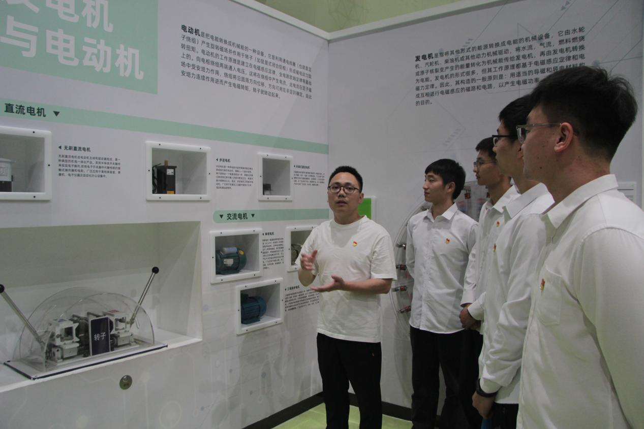第二党支部教师党员尤洋老师化身讲解员,带领全体党员有序参观了“院士专家成果展”,并从专业角度出发讲解了与机电员工专业相关的成果转化原理和生产实践应用。