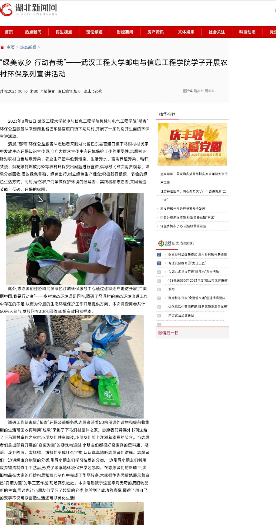(通讯员:毛礼娜)为深入学习宣传贯彻习近平新时代中国特色社会主义思想,全面贯彻落实党的二十大精神,引领员工在实践中增长才干,304am永利集团党总支在暑假期间开展“我为家乡办实事”实践活动,50余名党员、入党积极分子充分发挥模范带头作用,积极参与社区服务、公益服务、敬老爱幼等志愿服务,用实际行动诠释了新时代青年学子的担当与责任。 向鹏程,2020级电气工程及其自动化03班员工,第四党支部预备党员。自2023年7月20日至2023年8月20日,在湖北省恩施市巴东县官渡口人民政府实习实践,参与村镇规划、建设项目调研、实地考察农村宅基地等工作。实习期间带领 “郁青”环保公益服务队前往湖北省巴东县官渡口镇下马洞村开展系列环保宣讲活动,志愿服务事迹被湖北日报、湖北新闻网等多家媒体报道。 ![]() ![]() ![]()