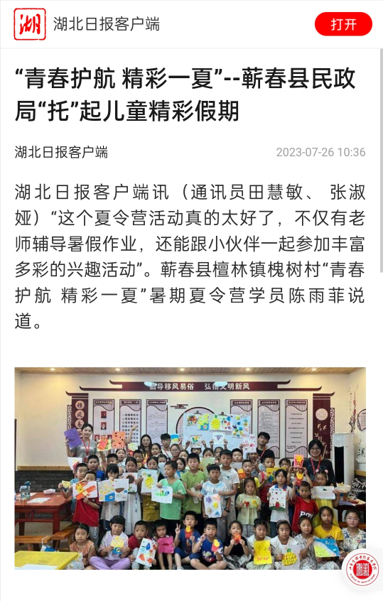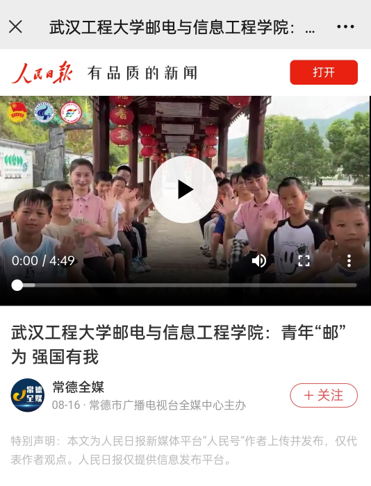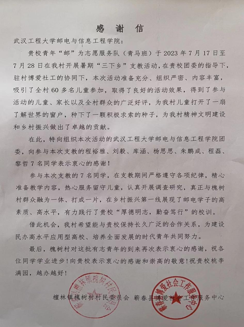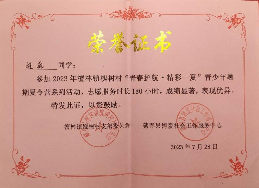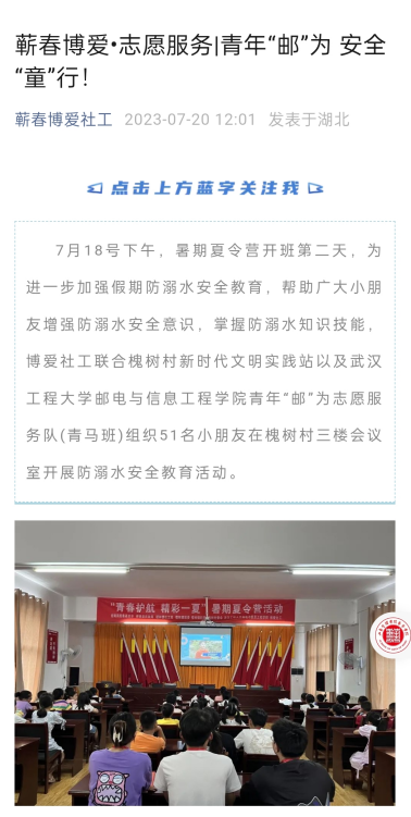 程磊,2020级电气工程及其自动化(兴发基地班)员工,第四党支部入党积极分子。2023年7月17日至2023年7月28日,跟随青年“邮”为志愿服务队(青马班)在蕲春县檀林镇槐树村幸福之家开展了为期15天的“七彩假期”志愿服务活动,老员工志愿者们化身小老师,用蓬勃朝气与青春热情打消孩子们的陌生与不安,用贴心陪伴与细心关怀赢得孩子们的信任与真情。志愿服务队聚焦“红色文化·铸魂、乡村文明·共享、艺术文化·传承”等主题,开设了朗诵、绘画、合唱、手工、劳动、普法、安全教育等多样课程,让孩子们沉浸式体验德智体美劳全面发展的“七彩假期”。服务事迹被人民日报,学习强国,湖北日报,湖北高校思政,檀林发布,蕲春博爱社工等多家媒体报道。