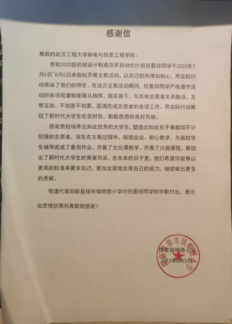 任震祥,2020级机械设计制造及其自动化01班员工,第三党支部入党积极分子。自2023年07月05日至2023年08月05日,参与了湖北省黄石市阳新县排市镇明德小学的七彩阳光支教工作。根据学校实际情况,科学制定了暑期教学计划,开组织开展了系列特色活动,完成了对300多名留守儿童的学习辅导和生活照料。实践过程中积极采用互动式、启发式教学法,识别和关注孩子们的个体需求,帮助他们解决实际困难,与他们建立了深厚的友谊。