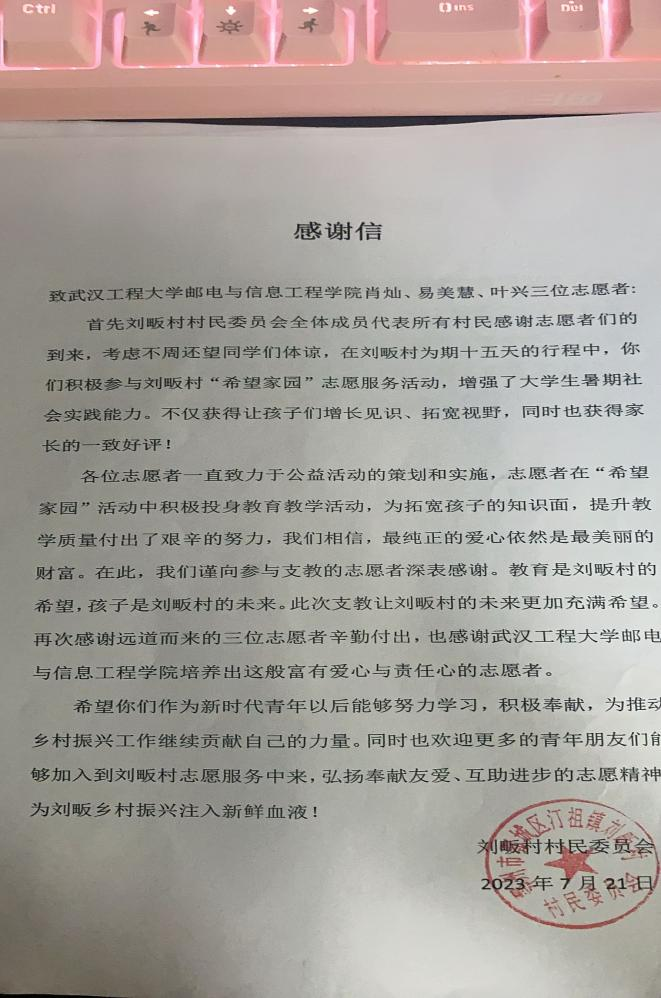 叶兴,男,2020级机械制造及其自动化03班员工,员工第三党支部入党积极分子。自2023年7月6日至2023年7月21日,参加了鄂州市汀祖镇刘畈村党员群众活动中心的“希望家园”暑假教育活动工作。通过课堂互动,将爱国主题教育、思想道德教育贯穿其中,在开展文化课的基础上还为同学们设计了折纸、音乐、绘画、体育等课程,借此培养员工的创造力、想象力和动手能力,培养员工的全面素质。刘畈村的负责人对志愿者们表示了诚挚的感谢,并赠予了感谢信。