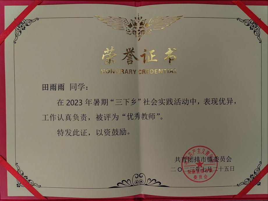 田雨雨,2022级机械设计制造及其自动化(智能制造方向)03班员工,第三党支部入党积极分子。自2023年7月06日至2023年8月28日,在湖北省黄石市阳新县排市镇中心小学担任数学教学工作,共同参与解决乡村学校课程单一、员工学习成绩不理想等问题,努力做孩子们的好伙伴、安全员、引路人,被排市镇团委评为“优秀教师”。