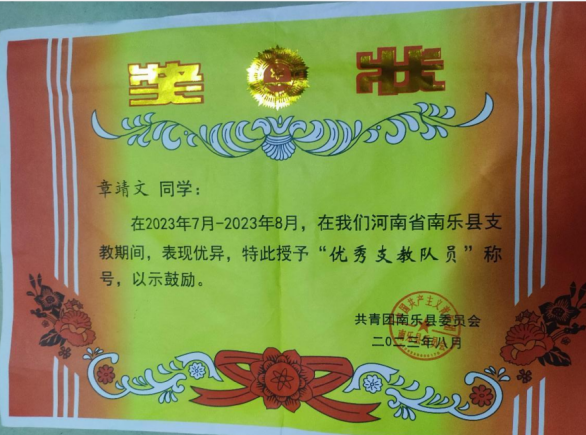 章婧文,2021级机械设计制造及其自动化(工业机器人方向02)班员工,第三党支部入党积极分子。自2023年7月10日至2023年8月5日,参与了暑期河南省南乐县官庄村官庄小学支教活动,为员工们呈现科学实验、音乐启蒙、手工制作、团体心理辅导等系列丰富而又精彩的课程,被南乐县团委授予“优秀支教队员”。