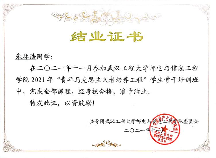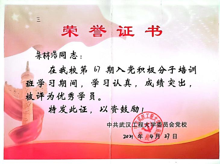 思想上,他具有坚定的政治信仰,认真学习党的理论知识,积极参与所在党支部和团支部的各项活动,切实提高自我思想和理论修养。在2021年4月参加第67期入党积极分子培训班,被评为优秀学员;在2021年11月参加学院“青年马克思主义者培养工程”暨员工骨干培训班,顺利结业。