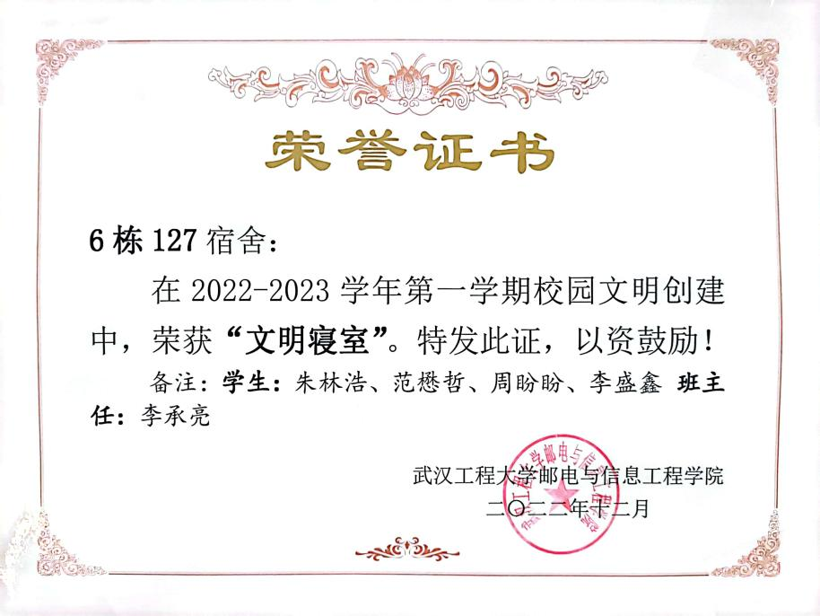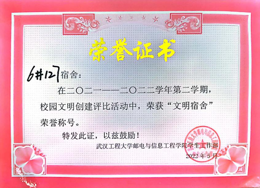工作上,他曾担任融媒体中心副主任,负责员工工作处、院团委微信公众号运营,多次完成院级重大活动拍摄任务及推文制作,工作考核优秀,同时作为寝室长,严格带头落实学院“四二一”工作,所在宿舍连续两学期荣获“文明宿舍”荣誉称号,充分发挥了党员的先锋模范作用。