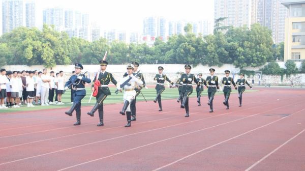 国旗班迈着整齐的步伐,护送五星红旗进场。在雄壮的《义勇军进行曲》伴随下,五星红旗冉冉升起,迎风飘扬。全体师生奏唱国歌,向国旗行注目礼。