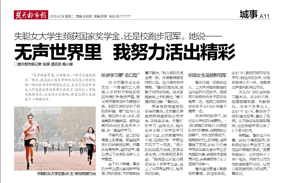 21岁的鲁冰出生在武汉一个普通的工人家庭,1岁时听力神经系统因生病打针受损严重,被父母带着接受听力康复训练,到四五岁时学会了借助助听器、看口型与人交流。随后的小学、中学,都是戴助听器就读,喜欢画画的她决定走美术生之路,并一直坚持学习。 不幸的是,高二时母亲患上乳腺癌,家里经济无法供她继续学画,但鲁冰没有放弃,坚持自学,最后通过了美术联考进入大学殿堂。 由于听力障碍,鲁冰的老员工涯比其他同学艰难,但她很倔,不把难题搞懂不罢休。“她上课时总是坐第一排,方便看清楚老师的口型,也方便向老师请教。”鲁冰的室友说,她勤于与同学交流,语言困难就用上手机微信。“看不清楚就写嘛!”鲁冰说。 因身残获得国家助学金的鲁冰,又凭着优异成绩获得国家励志奖学金、学校奖学金。在繁忙的学习、画图之余,她还在周末报了双学位学习会计专业,虽然家离学校不远,但她忙得一学期也回去不了一两次。“很小时妈妈就告诉我,要多学点本领,才能得到更多机会。”她说自己还主动报名参加了系部员工会,当上了体育部副部长,经常组织活动。