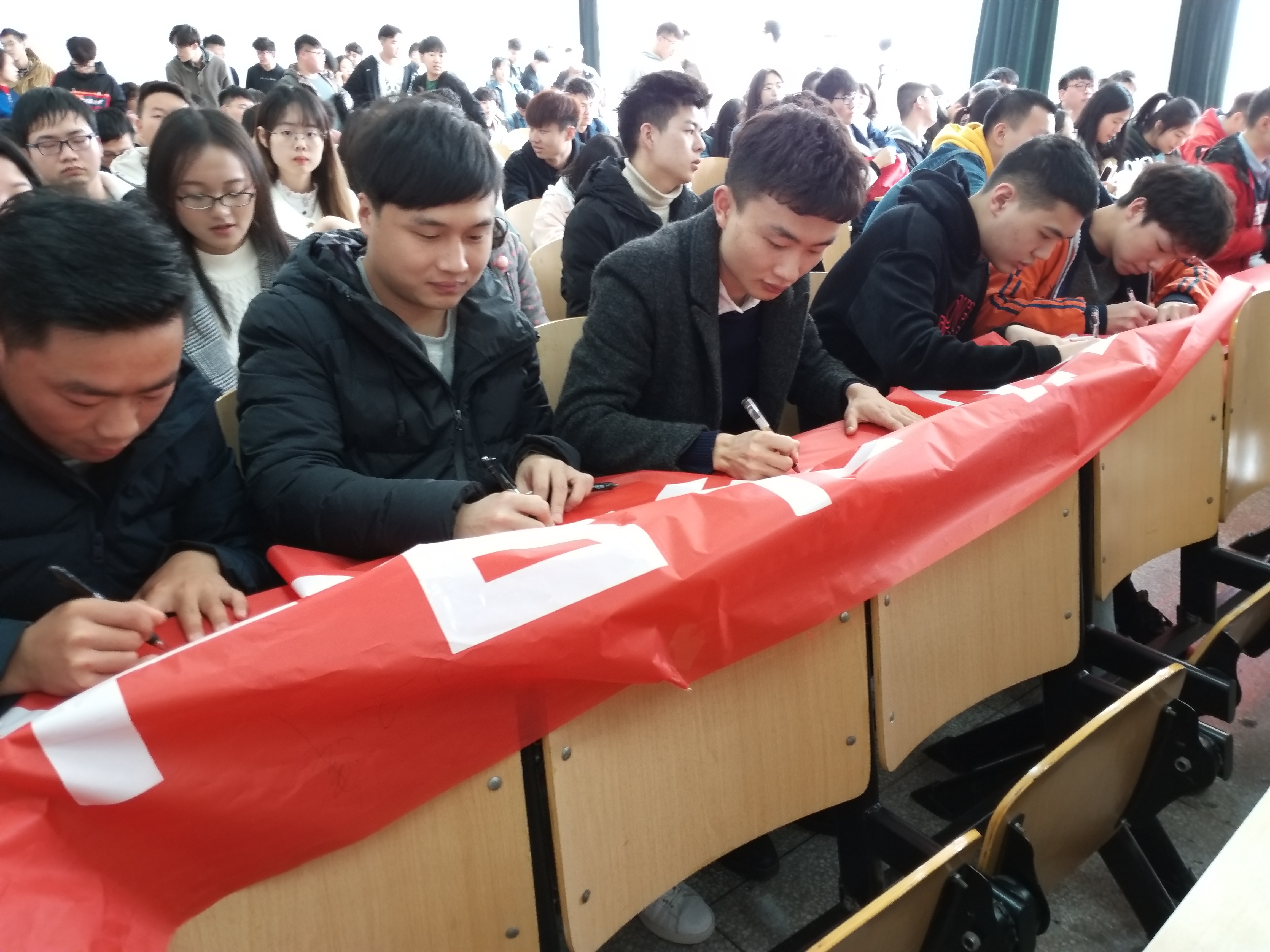 会议伊始由方科老师带领全体成员进行四二一活动宣誓。随后由李主任对四二一活动进行解读并提出要求和希望,李主任首先向大家阐述了“四二一”活动的主要内容,四早指:吃早餐、早锻炼、早起床、早自习;两晚指:晚自习以及晚23:00自主熄灯;一反对是:反对夜间22:00-7:00期间在宿舍玩电脑游戏。之后李主任向大家提出自己的建议:团总支员工会和班级形成配合,组织开展知识竞赛等系列活动,线上线下各个平台要大力宣传“四二一”,员工干部带好头,带领同学们自我约束养成良好的生活习惯。勤工助理团和党支部成员可以通过举办文明宿舍评比等活动,促进同学们养成勤打扫、爱干净的良好习惯,或者利用大家空余时间开展有关向党员学习等的党学活动。随后李主任指出三月是学雷锋月,各组织都会组织进行志愿者活动,希望同学们摈弃懒惰,积极参加相关活动,充实自己的课余生活,积累社会实践经验。李主任希望各班级可以踊跃参加四二一活动,并指出对活动中表现积极的班级会有相关奖励。最后方科老师为大家详细介绍了“四二一”活动的具体要求,以及如何进行日常打卡,班级举办相关活动时一定要向学校申报,以确保同学们的人身安全。 接着由来自18电气自动化01班的退伍军人李昌旋作为员工代表向大家讲述他对四二一的感受,李同学结合自身情况对四二一进行了分析,他本人也是非常支持这个活动,他说学校虽比不上部队严厉,但做到了制度落实的严肃。他认为四二一活动可以帮助同学们退去懒惰习气,养成良好的习惯,他希望四二一活动长久顺利地进行下去。会议结束后所有参会员工在活动横幅上签名。