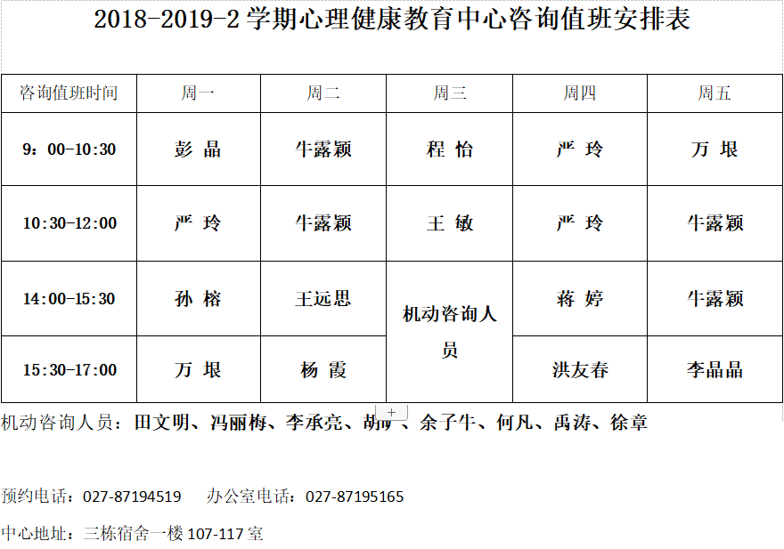 一、服务对象 二、服务原则 免费性原则:在校老员工可享受免费咨询,不限次数; 保密性原则:按照相关工作要求,对来访员工基本信息保密; 三、预约方式: 1、电话预约:027-87194519;027-87195165 2、q q预约:2373824423 3、平台预约:高校员工心理健康管理与服务平台http://xlzx.witpt.sibetech.cn:90/xlwitpt/login 4、现场预约:老员工心理健康教育中心接待室(3栋107室) 四、预约时间 1、电话及现场预约时间:周一至周五8:00-12:00;14:00-18:00 2、网络预约:不受时间限制 五、预约注意事项 1、来访员工一般应提前半个工作日进行预约。 2、预约人员必须在确定预约的时间来心理健康教育中心面询,预约人员因特殊原因不能准时面询者,必须及时与心理健康教育中心进行联系调整事宜。