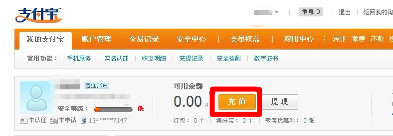 2、登陆成功后,可看到账户余额等相应的账户信息。点击充值,可进入