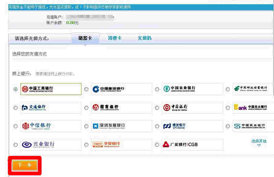 3、进入充值界面,选择可用的网上银行,点击下一步