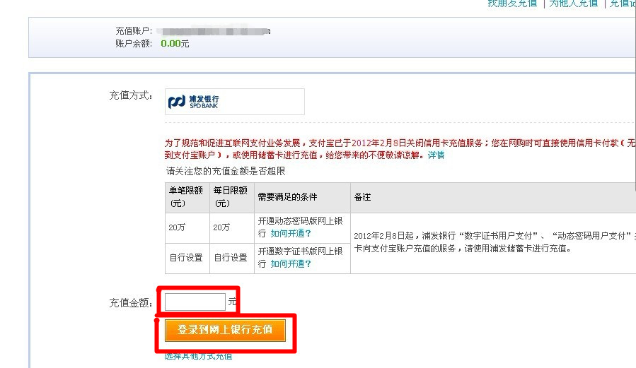 4、填写相应的充值金额,点击“登陆到网上银行充值”,系统会自动跳转到相应的网上登陆界面(每个银行的网上支付页面不同,请根据提示操作),利用网上银行充值成功后,支付宝会显示相应的账户余额。