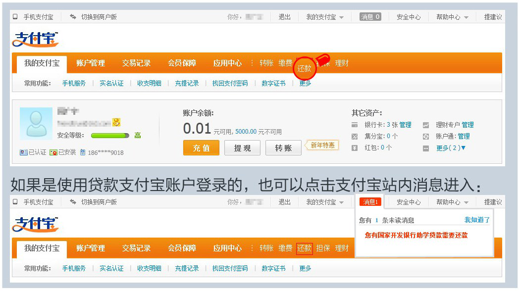 一、使用贷款时支付宝账户还款(适用知道支付宝密码、开通了网银的员工)