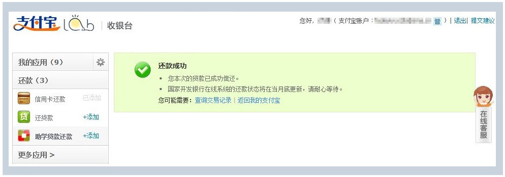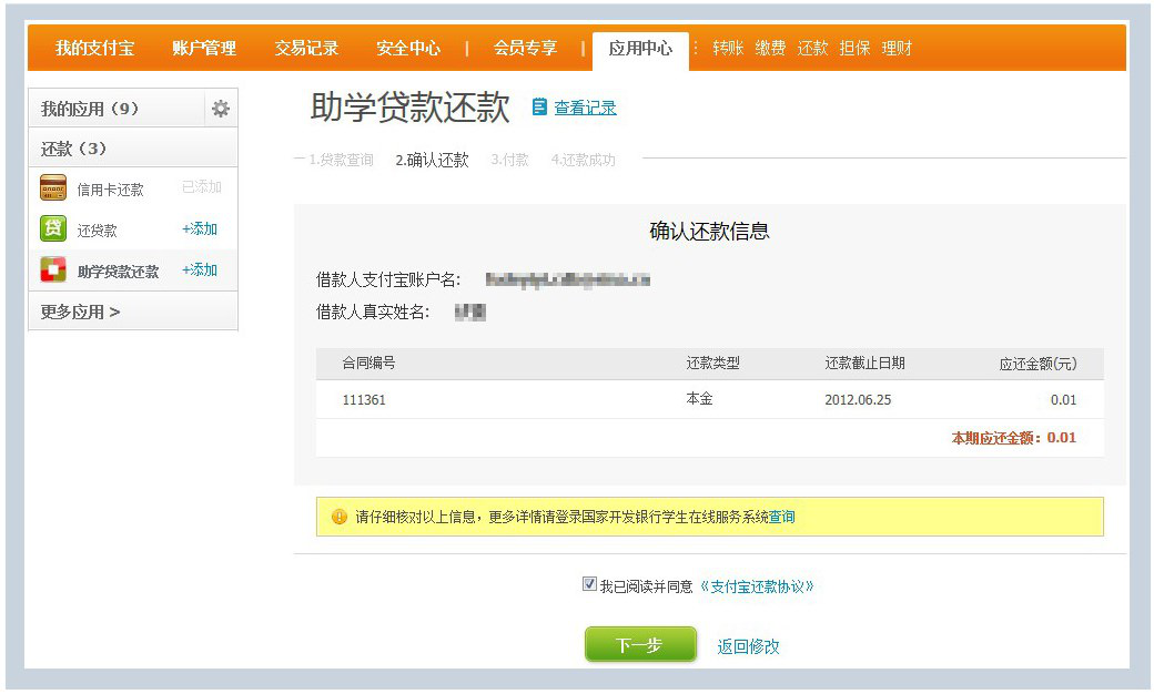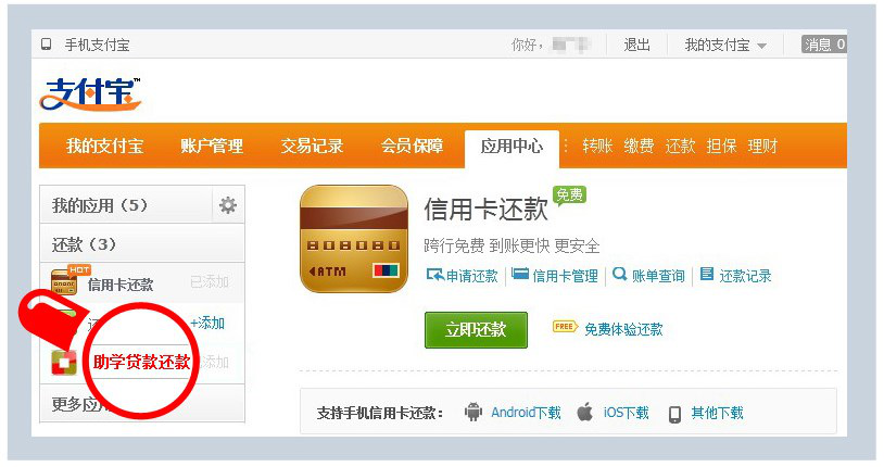 选择了支付宝作为还款方式员工,再查询出应还款金额后,可以按以下操作进行还款: