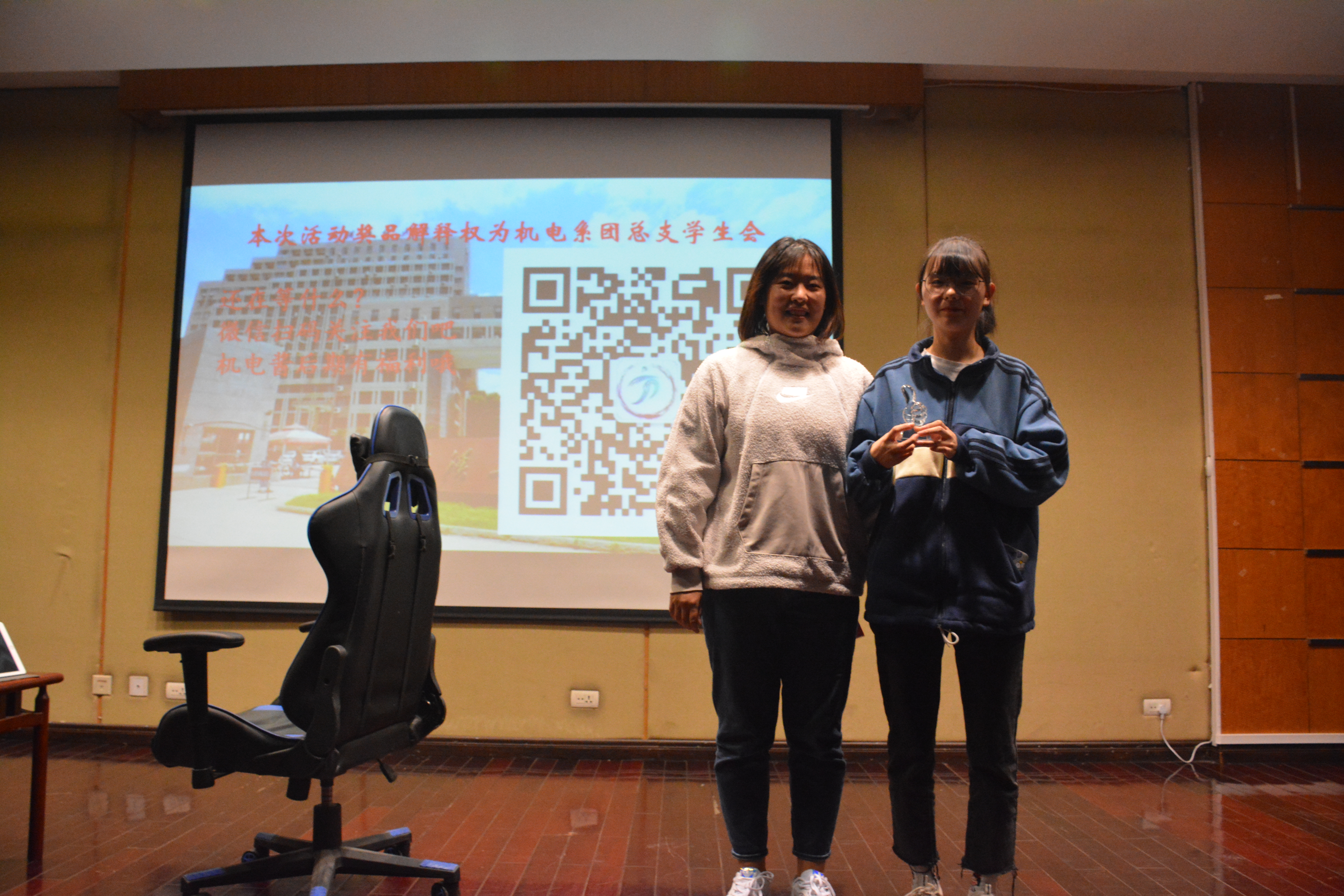 比赛伊始,由机械与电气工程系团总支书记陈旭致辞:他希望选手们在接下来的比赛中能有精彩的表现,取得自己满意的成绩,也希望现场观众通过问题能够学习到新知识。随后,知识竞赛正式开始,一号的选手可能是因为紧张,审题不仔细,在第一题就惨遭淘汰。后面的选手们渐入佳境,或是一轮游,或是见好就收,带着已得的奖品离开赛场,亦或是冲击最终大奖,虽败犹荣。随着两轮的观众答题环节结束,比赛进入了白热化。终于,第七位选手十道题目全部答对,成为“机电之星”称号候选人。而在后面的角逐中,由于题库的一点错误,一位选手进入复活赛,而他也没有辜负,顺利答对十道题,与七号选手共同竞争“机电之星”。根据答题所用时间的长短,最终由19级计算机科学与技术02赵桢同学获得“机电之星”荣誉称号,19电气工程及其自动化兴发基地01班徐健同学获得一等奖。随后机械与电气工程系王徐雪老师为选手颁发奖品并合影留念。