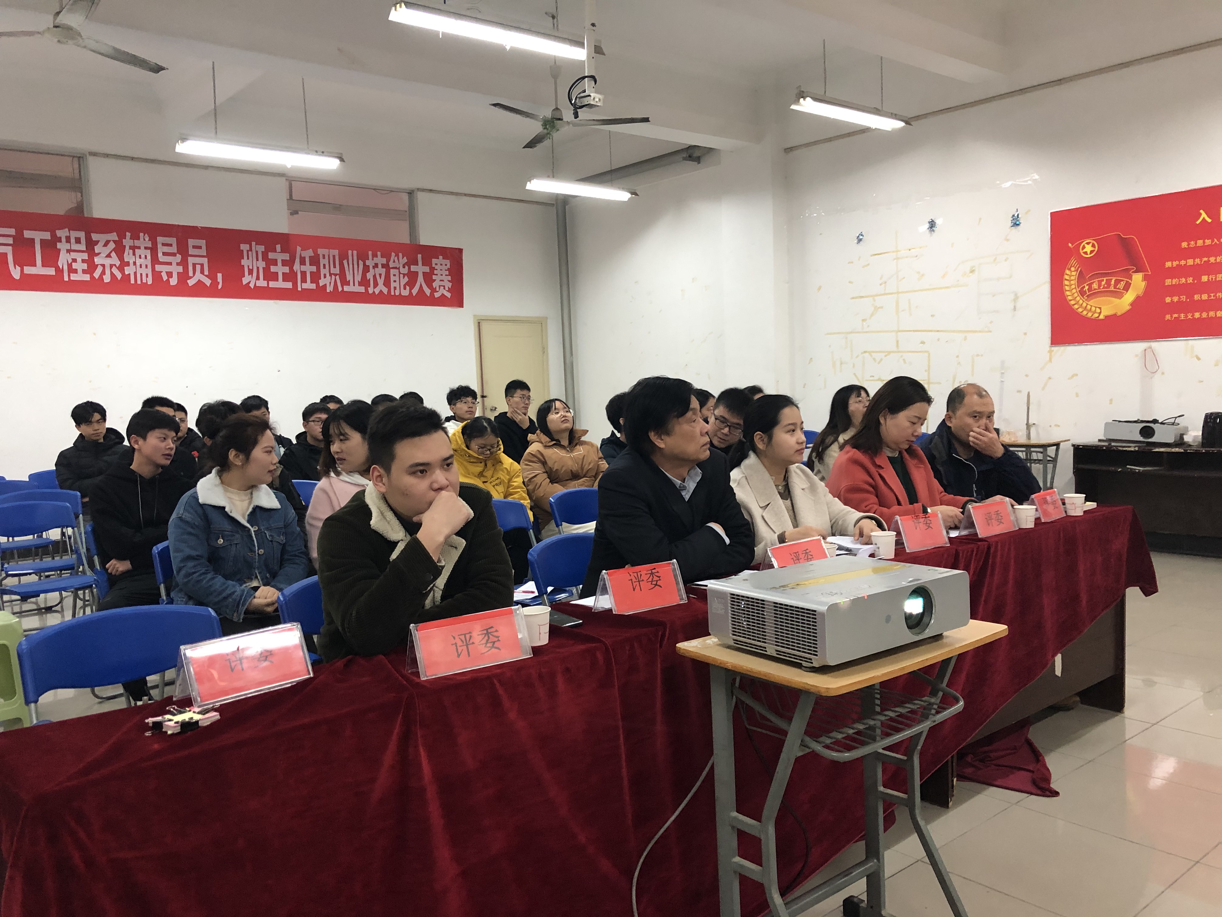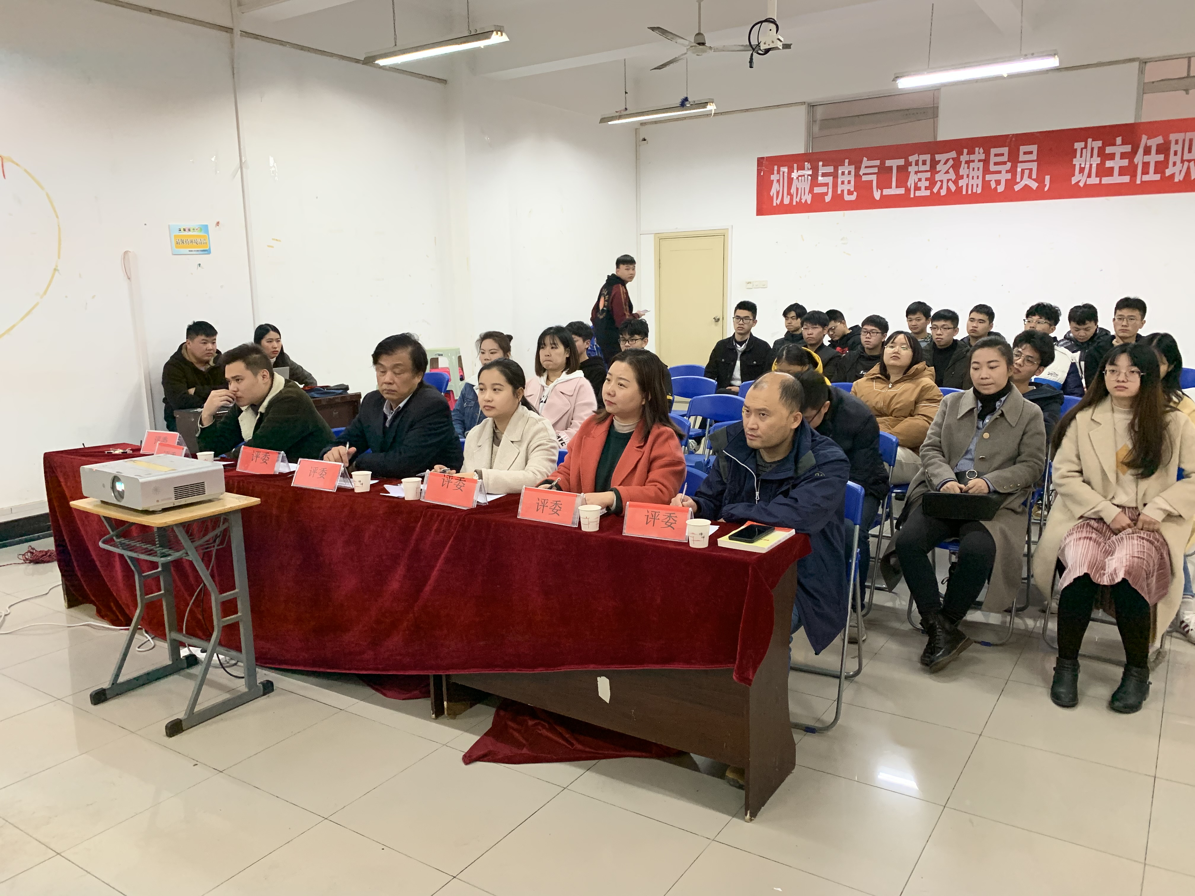 (通讯员:李倩倩 摄影:新闻部成员) 为了不断提升德育工作水平,进一步提高班主任的业务水平和工作能力,结合工作的相关计划安排,机械与电气工程系于2019年12月4号在一食堂三楼302举办了辅导员、班主任职业技能大赛。出席本次活动的评委老师有机械与电气工程系主任赵振华老师、机械与电气工程系党总支副书记李承亮。