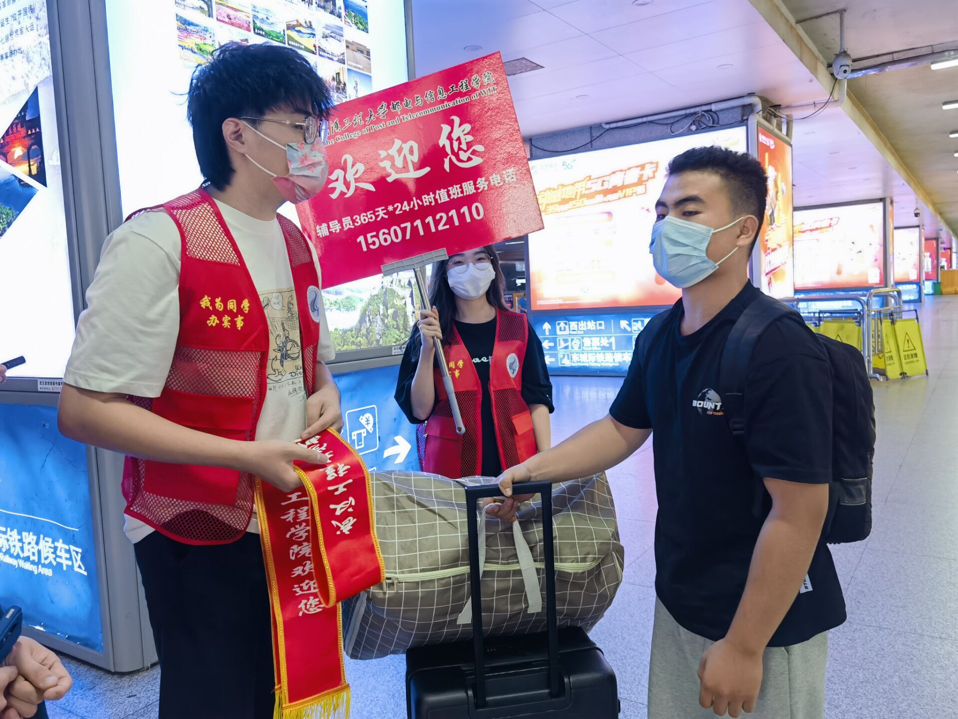 在车站里,党员同志热情为新生服务指引方向、帮助搬运行李、协助换乘转车,高效为新生保驾护航,精准对接到校,展现党员风采,成为迎新现场一道流动的“红色”风景线。